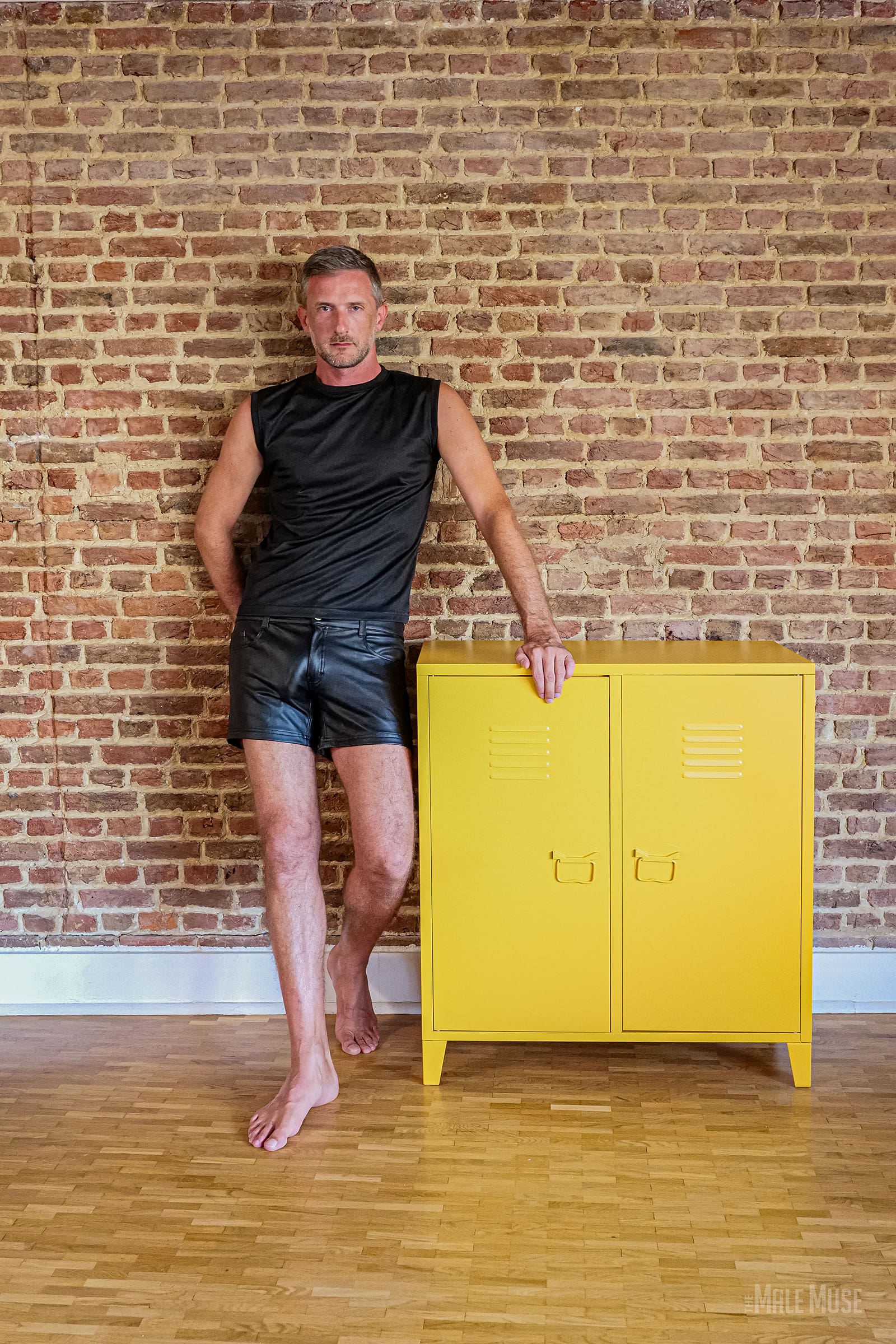 Infinite Aura brings some sexy daddy mojo to The Male Muse in this series called “Tool Storage.” Wearing a pair of snug leather shorts and posing beside a bright yellow chest, Infinite Aura’s huge tool is impressively straining to get out of its confinement, perfectly outlined behind the tight leather. After a little teasing, his juicy, uncut cockhead is soon poking out the side of the shorts, demanding attention. Once the pesky garment comes off, his pride and joy is stiff and ready for good use. Infinite Aura plays with his impressive forskin before posing to show off his hairy legs and sexy backside.